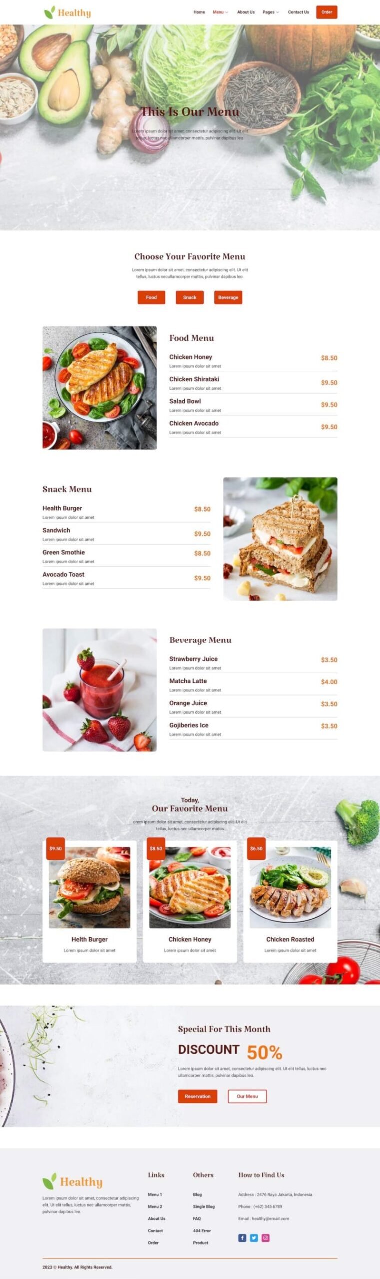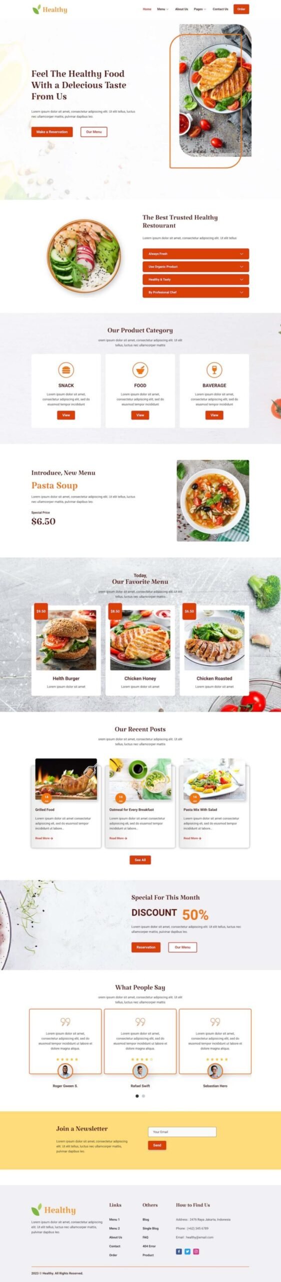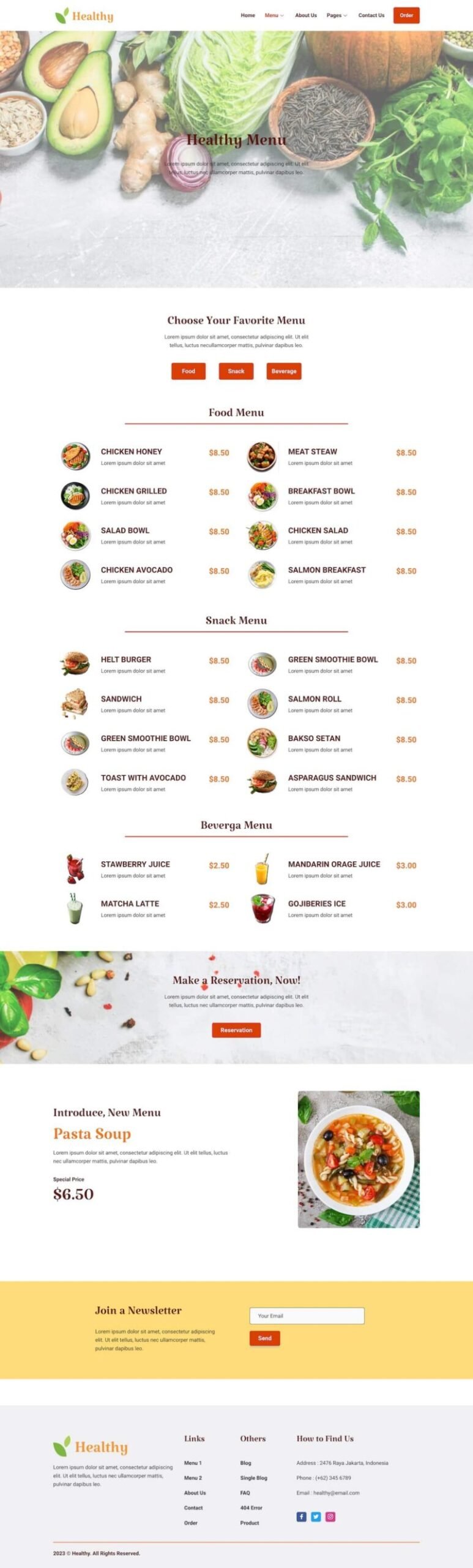 A fresh and modern design created for health-focused restaurants and cafes. This template highlights nutritious menus, special healthy dishes, customer testimonials, and an easy reservation system. Perfect for promoting a lifestyle of wellness and attracting health-conscious diners.